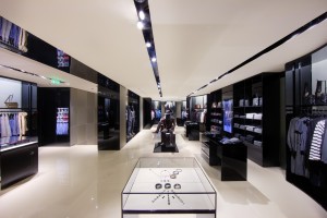 Zīmols Emporio Armani īpašu uzmanību pievērš materiālu izvēlei. Gaišās krāsās ieturētais griestu marmorino stila apmetums un Indijas pelēkā akmens grīdas piešķir telpām mūsdienīgumu. Veikala klāstā esošie aksesuāri izvietoti uz stikla plauktiem ar fona apgaismojumu, kas veido zīmola precēm spēcīgu un harmonisku vizuālo efektu. Šo veikalu atmosfēra ievirza iepirkšanos jaunā, moderna luksusa līmenī.