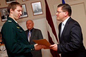 Iekšlietu ministrs Mareks Segliņš (TP) ar ministrijas Goda rakstiem trešdien apbalvoja 17 Valsts robežsardzes (VRS) volejbola izlases komandas "Lāse-R" trenerus un spēlētājus, kuri trešo gadu pēc kārtas kļuvuši par Latvijas čempioniem.