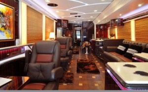 Stāvvietā lainera sienas izbīda uz sāniem, palielinot iekštelpu platību. Gan izbīdāmo sekciju, gan paša autobusa grīdas un sienas izklātas ar dārga koka paneļiem, ērti ādas klubkrēsli tā vien aicina savos skāvienos, bet komforta apgaismojumu klients var mainīt pēc saviem ieskatiem un garastāvokļa.