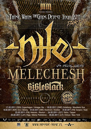 Piektdien, 25. februārī, Rīgā “Those Whom the Gods Detest” koncertturnejas ietvaros klubā „Melnā Piektdiena” uzstāsies ASV brutal tehnical death metal leģenda grupa “Nile”. Jaunais albums daudzu ekstrēmās mūzikas kritiķu un fanu vidū tiek vērtēts kā grupas spēcīgākais un, iespējams, labākais veikums līdz šim. Otra - arīdzan ne mazāk unikāla muzikāla vienība - Mezopotamian black/thrash metal grupa “Melechesh” prezentēs savu jaunāko veikumu “The Epigenesis”. Klausītāju uzmanībai, jaunu iespaidu un priekšstatu gūšanai Skandināvijas virzienā uzstāsies arī grupas “Pressure Points” (progressive death metal) no Somijas, “Goat the Head” (death metal) no Norvēģijas un “Bibleblack” (melodic death/ thrash metal) no Zviedrijas.