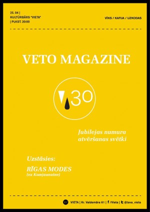Piektdien, 25. aprīlī, plkst. 20.00 kultūrbārā Vieta notiks Veto Magazine #30 žurnāla atvēršanas svētki kopā ar grupu Rīgas Modes (ex. Komjaunatne) un labu mūziku arī pirms un pēc.