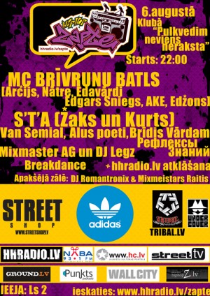 Ceturtdien, 6.augustā, klubā "Pulkvedim neviens neraksta" notiks trešais ikmēneša HIPHOPA ZAPTEs pasākums, kura centrālais notikums būs MC brīvrunu cīņas.