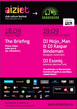 Sestdien, 19. septembrī, klubā "Greenwood" festivāls "Aiziet" turpinās ar EverGreenWood Night. Spiedzošo meiteņu pavēlnieki Dr. Mojo_Man & Dj Kaspar Bindeman /evergreen rockenrolla'/ un Dj Esoniq /american oldschool funk/, naktī vizualizācijas no 69.gada Woodstockas festivāla un amerikāņu oldschool filmām. Smailo spicpurnu kurpēm laiks gulēt augstākajos plauktos, puķainās pastaliņas sāk savus ritmus!
