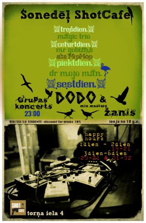 Sestdien, 27. februārī, plkst. 23:00 “Shot Cafe”, Torņa ielā 4, koncertēs grupa “Dodo”.