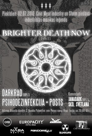 2. jūlijā ekskluzīvā koncertā Rīgā viesosies viens no Eiropas ekstrēmās mūzikas tēviem – Roger Karmanik jeb Brighter Death Now no Zviedrijas. B.D.N. mūzikai, šķiet, visatbilstošākais raksturojums ir death industrial. Tā satur smagas un ļoti zemas atmosfēriskās vibrācijas, papildinātas ar ellīgu analogo sintezatoru kaukoņu, apdullinošu sistemātisku nekro-pulsu, tematiskiem sampliem, industriālām graboņām, klaudzieniem un žvadzoņām, ko pāršalc modulēts baltais troksnis un provokatīvas klaigas. No smagnēja ambient līdz power electronics B.D.N. neapšaubāmi ir viena no vistumšākajām ikonām post-industriālajā un laikmetīgajā mūzikā kopumā. Roger Karmanik ir šaušalu uzdzenošu frekvenču ģenerēšanas un komponēšanas meistars, kas strikti pieturas pie vecās skolas industrial un pagrīdes elektronikas tehnikām skaņradē, un panciski nihilistiskās pieejas skatuviskajam tēlam. Šis pretrunīgais muzikālais tēls internetā visai trāpīgi raksturots kā draisks skuķis, kas vienā acumirklī var emulēties maniakālā slepkavā. Otrs vakara viesis ir maskaviete JanaDark, kas ir starptautiski zināma DJ, un viņas tribal/ rhythmic noise projekts Darkrad. Darkrad ir smagās ritm-industrijas sintēze ar tribal un experimental elementiem, katrā koncertā paredzot vietu arī negaidītiem, improvizētiem risinājumiem. Viņa ir dalījusi vienu skatuvi ar tādiem grandiem kā Brighter Death Now, IRM, Allerseelen, Mono No Aware, Mimetic, Cervello Electronico, Noisuf-X, This Morn’ Omina, P.A.L., kā arī uzstājusies kopprojektā ar Empusae. Vakara viesus iesildīs viens no vietējās pagrīdes elektronikas enigmām – Toms Šiklovs ar projektu Psihodezinfekcija. Par vakara sistemātisko ritm-tektoniku gādās JanaDark [Ru], savukārt aukstas industriālās vakariņas servēs SKD un Svetlana. Pasākumā varēs vērot trash kino izlasi, kā arī būs iespējams iegādāties Cold Meat Industry un Sturm izdevniecību produkciju. Ieeja pasākumā no 20:00, tikai 5Ls. Lai iekļūtu pasākumā, obligāti jāierodas ar izdrukātu caurlaidi, ko var iegūt sturmmandat.com pasākuma sadaļā. Adrese: Balasta dambis 3 - Bumbu patvertne zem Preses nama, Rīga
