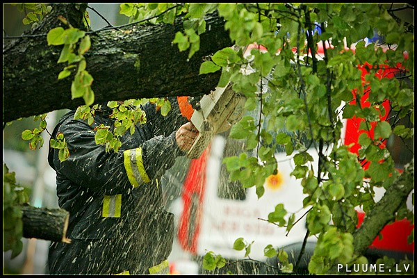 Svētdienas vakarpusē Rīgā pūta stiprs vējš un lija spēcīgs lietus.