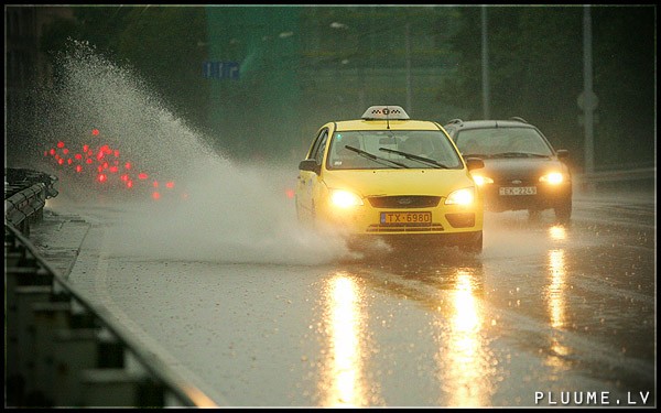 Svētdienas vakarpusē Rīgā pūta stiprs vējš un lija spēcīgs lietus.