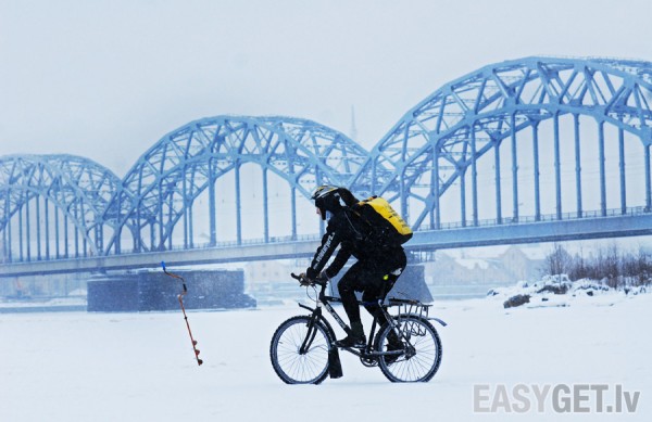 Foto: Velokurjeri uz Daugavas ledus