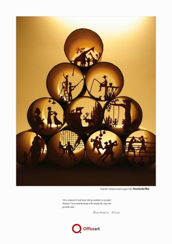 Katalogā apkopoti 13 pasaulē atpazīstamāko biroja mākslinieku darbi, vāka dizaina autore ir viena no Londonā pieprasītākajām papīra māksliniecēm Jūlija Brodskaja.