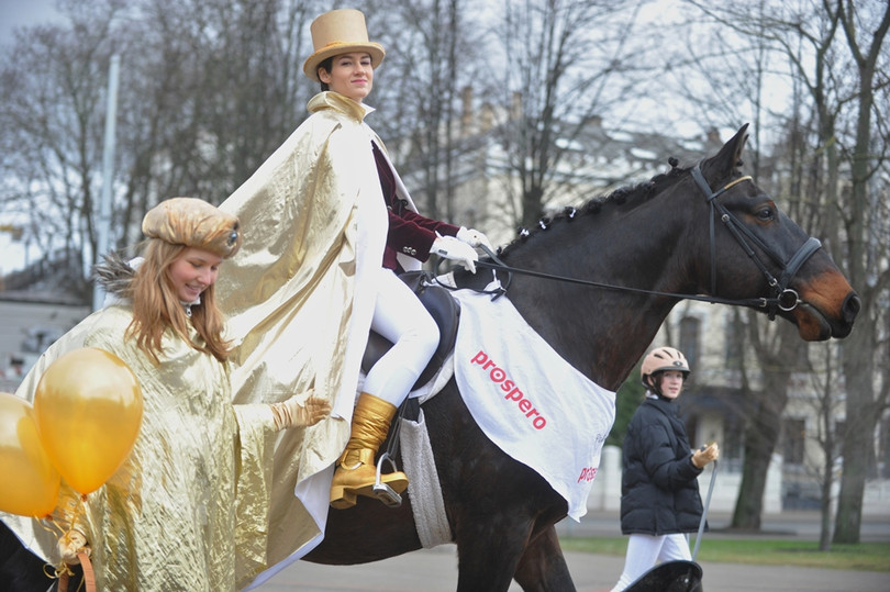Vēlot enerģisku un raženu Zirga gadu visiem sastaptajiem, ceturtdienas rītā Rīgas centru izstaigāja Laimes zirgs.