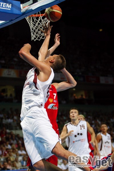 Piektdien Latvijas Nacionālā vīriešu basketbola izlase „Arēnā Rīga” izcīnīja vēsturisku uzvaru ar 87:80 pārbaudes spēlē pret Krievijas valstsvienību. Šī bija pēdēja Latvijas izlases atrādīšanās savu skatītāju priekšā pirms Eiropas čempionāta, kurš šogad notiks Spānijā. Par mača MVP tika atzīts Sandis Valters, kurš atzīmējās ar 17 gūtajiem punktiem. lasīt vairāk »