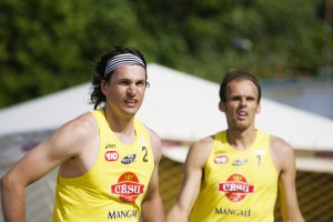 Trešajā spēlē latvieši ar rezultātu 2-0 (21:17, 21:12) pārspēja Polijas duetu Mihalu Kadziolu un Jakubu Salnakēviču, savukārt pēc tam ar 0-2 (13:21, 17:21) pārliecinoši piekāpās Brazīlijas duetam Rodžeriu de Souzam Fereiram un Janam de Souzam Fereiram, no tālākas cīņas izstājoties.